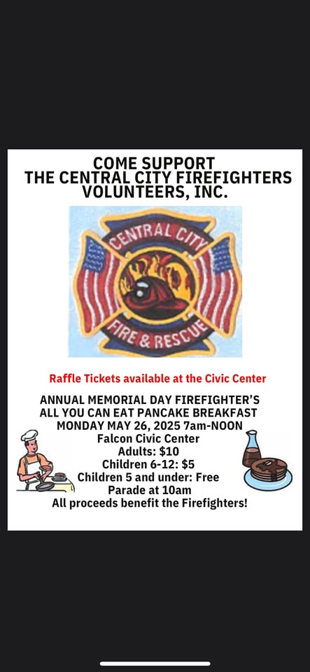 May 26 @ 7:00 am - 12:00 pm 3rd Fire District Pancake Breakfast Falcon Civic Center 137 4th St N, Central City, IA, United States